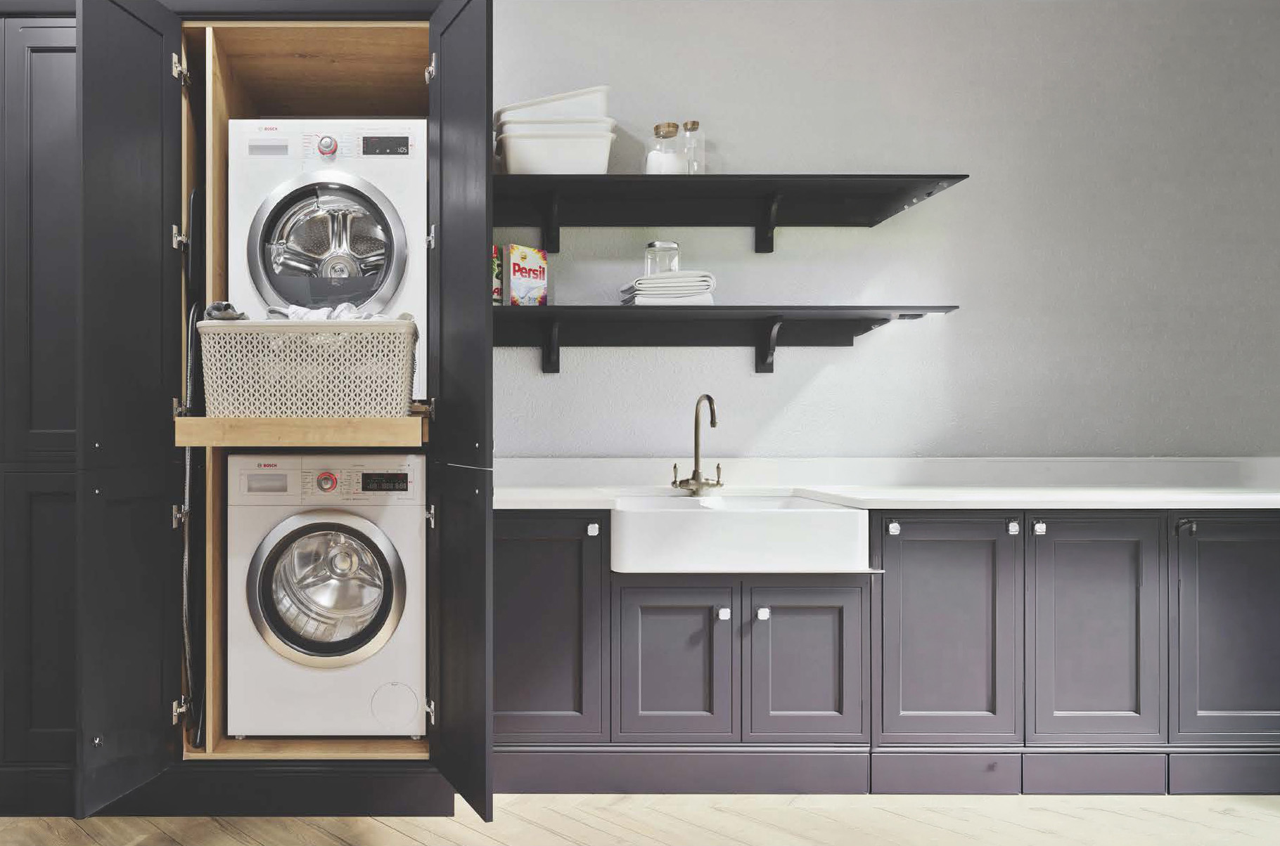 Above & top of page: image from House Beautiful April 2026 - feat. extra tall Hutton laundry stacker larder by LochAnna Kitchens, with Bosch appliances